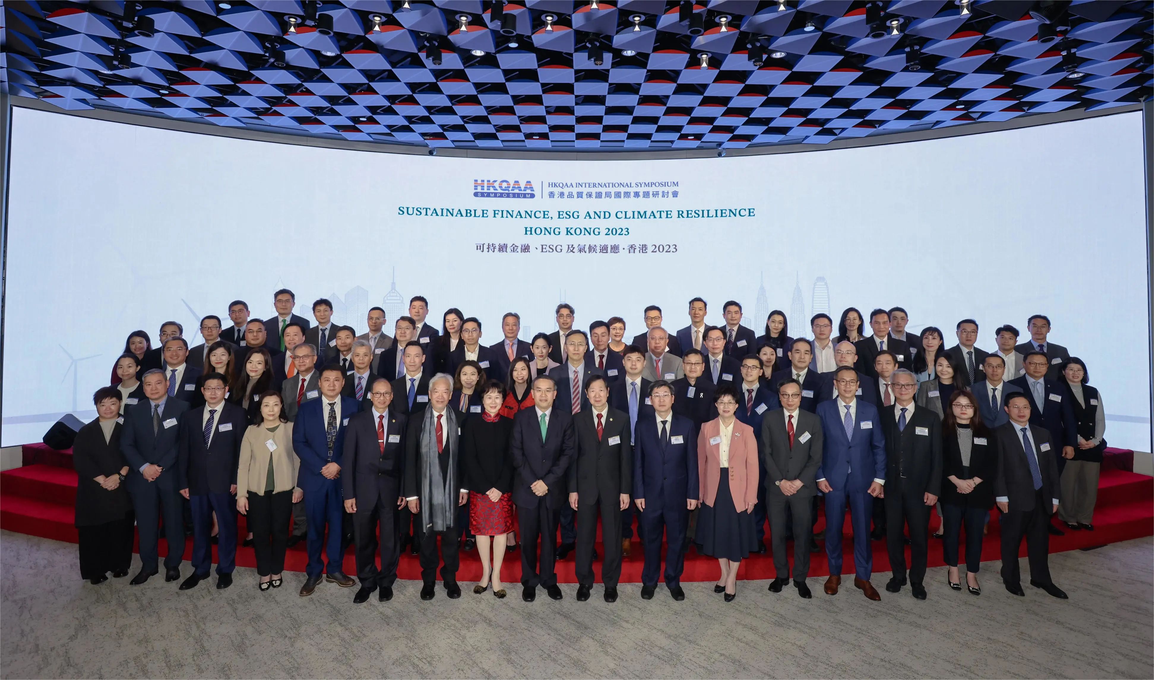 主礼嘉宾、特别嘉宾、香港品质保证局董事局成员及支持绿色和可持续金融、ESG 和气候披露的企业与金融机构合影